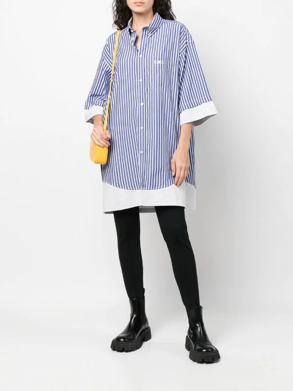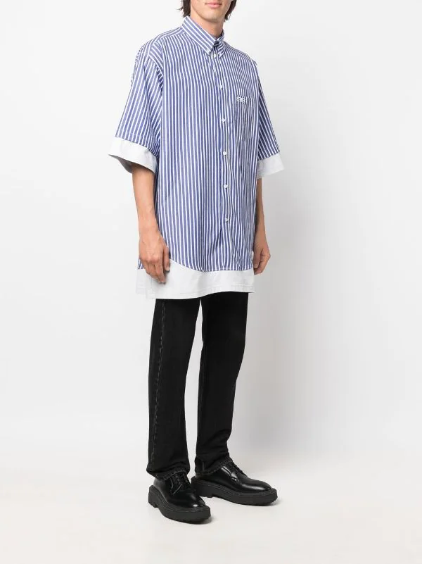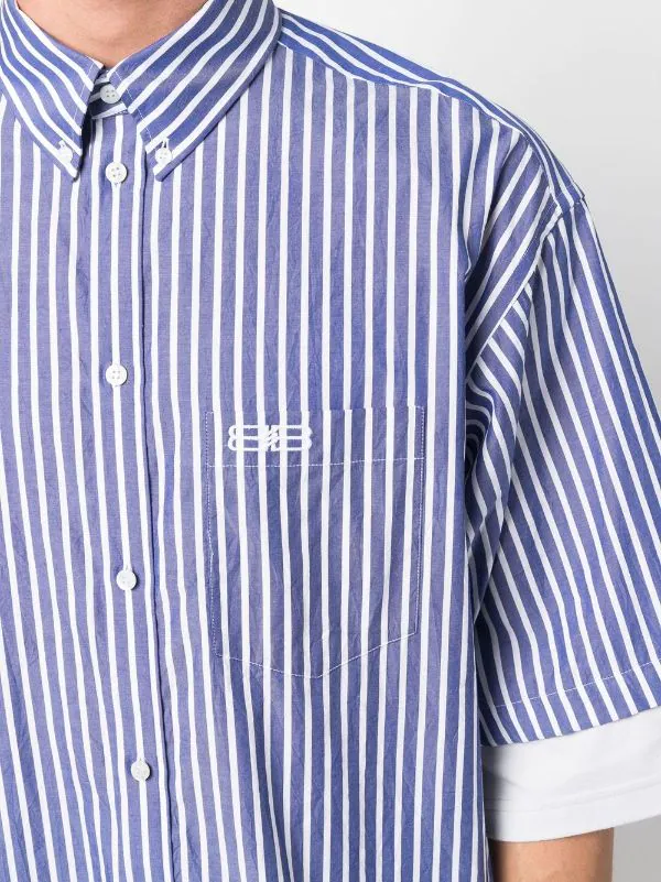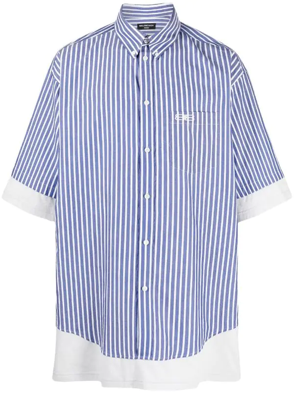 Bleu, blanc, coton, tissage popeline, rayures verticales imprimées, détails superposés, logo brodé sur la poitrine, col boutonné, boutonnière sur le devant, poche poitrine plaquée, manches courtes.