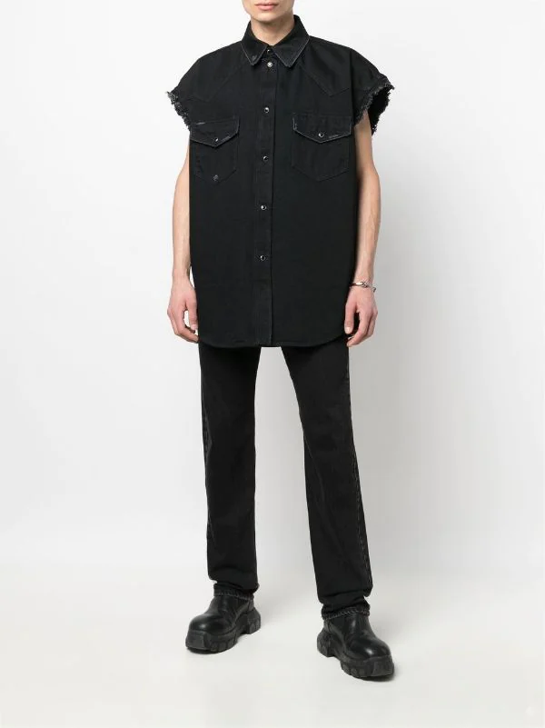 Noir, coton, bords francs, manches courtes, boutonnière sur le devant.