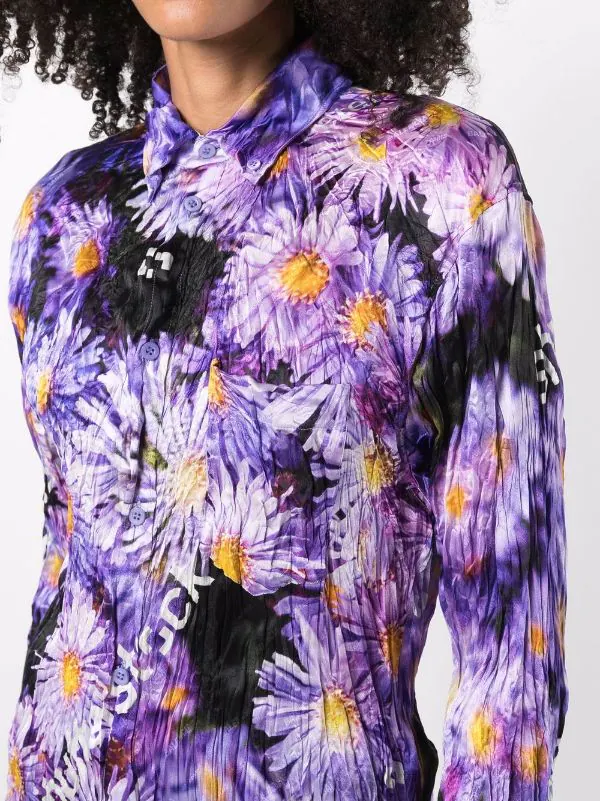 Motif de fleurs, slogan imprimé, effet froissé, col boutonné, effet d’épaules descendues, boutonnière sur le devant, manches longues, poignets boutonnés, poche poitrine plaquée, ourlet incurvé. Couleur : violet. Matière : soie.
