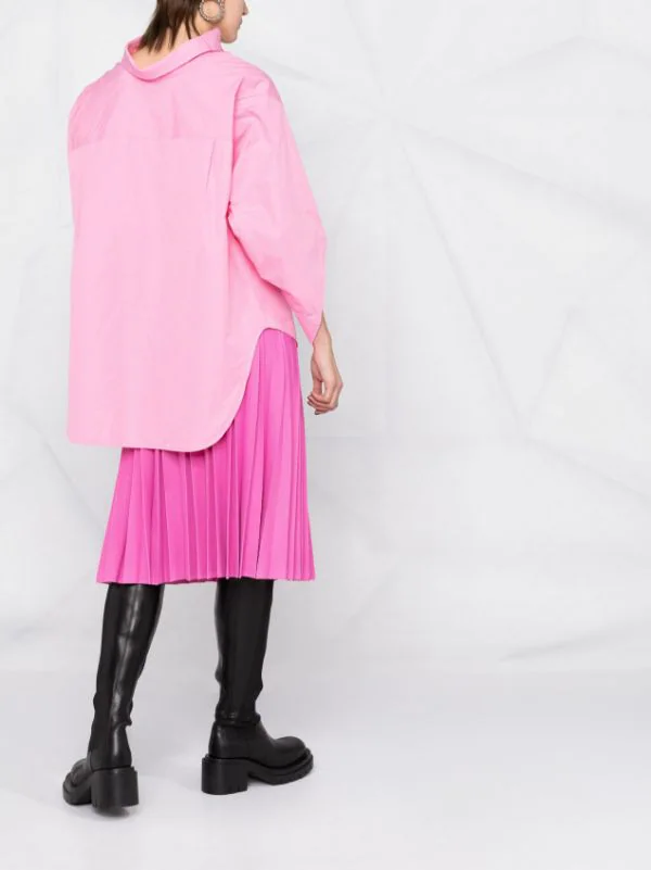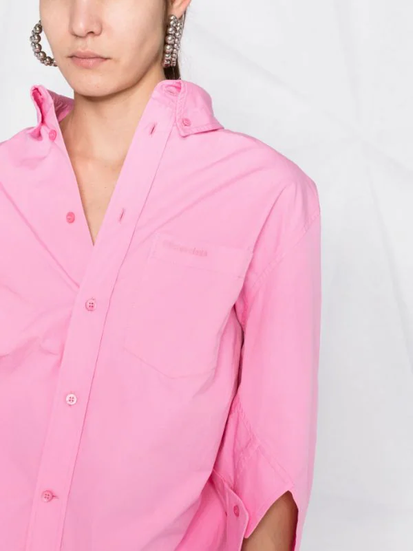 Col boutonné, épaules tombantes, boutonnière sur le devant, poche poitrine plaquée, manches mi-longues, ourlet plus long au dos. Couleur : rose. Matière : coton.