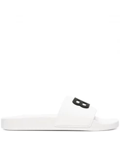 Détail de logo embossé, design à enfiler, bout ouvert, semelle en caoutchouc. Couleur : blanc.