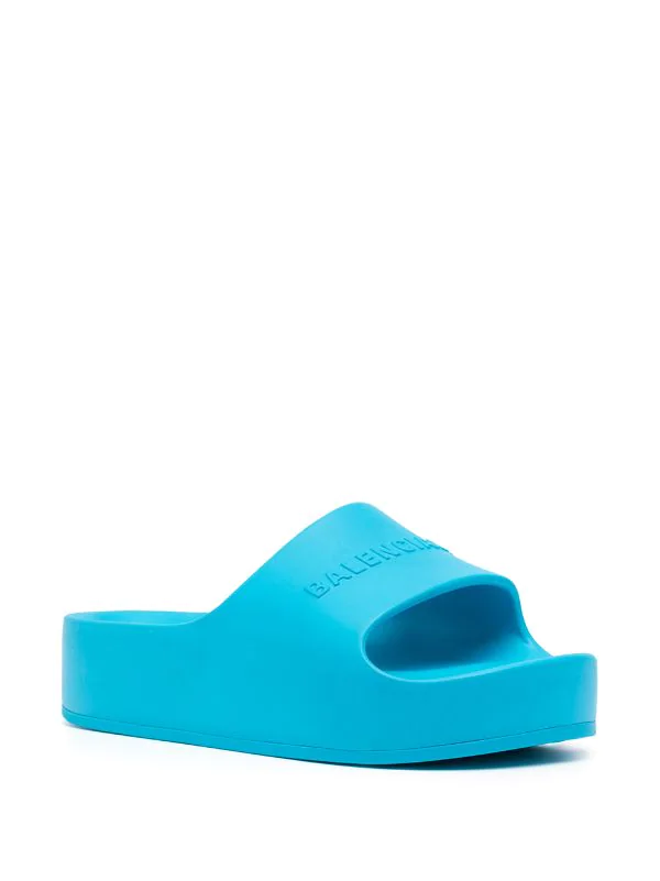 Logo embossé, bout ouvert, bout rond, design à enfiler, semelle à plateforme. Couleur : bleu.