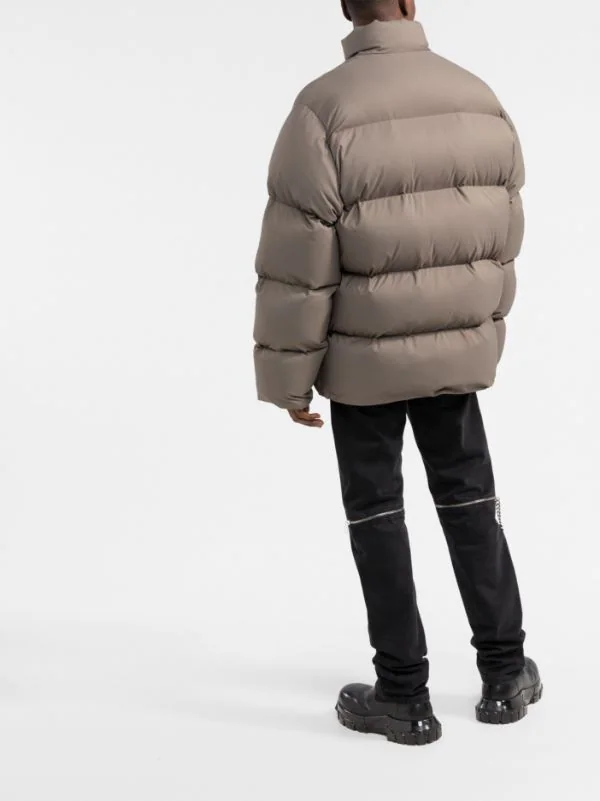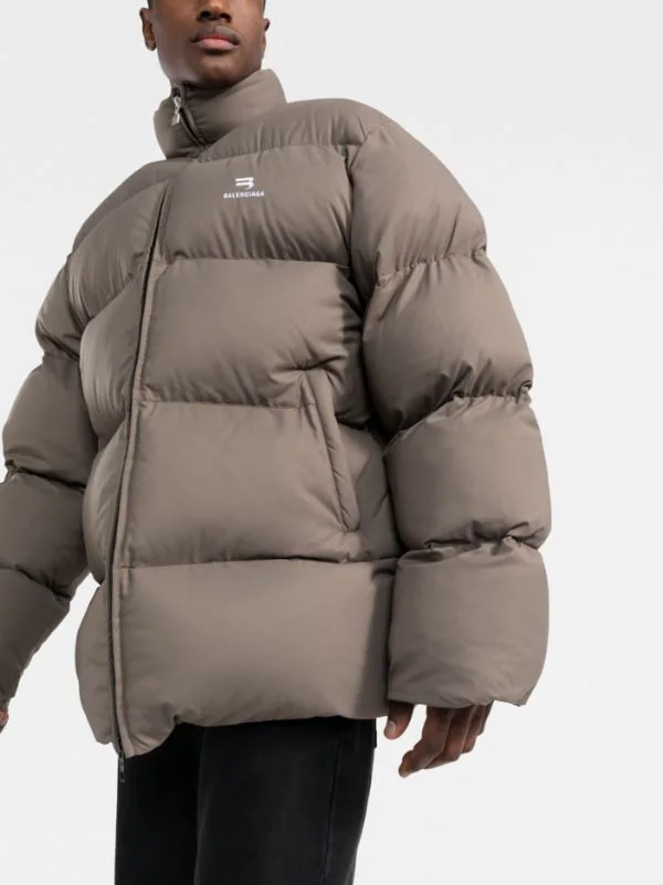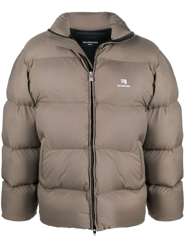 Logo imprimé à la poitrine, design matelassé, col montant, fermeture zippée devant, manches longues, deux poches latérales fendues. Couleur : marron.