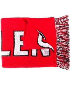 Bordure à franges, tricot intarsia et logo contrastant. Couleur: rouge. Matière: laine mélangée.