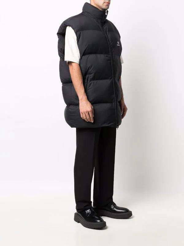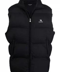 Logo imprimé à la poitrine, design matelassé, col montant, fermeture zippée devant, design sans manches, deux poches latérales fendues. Couleur : noir.