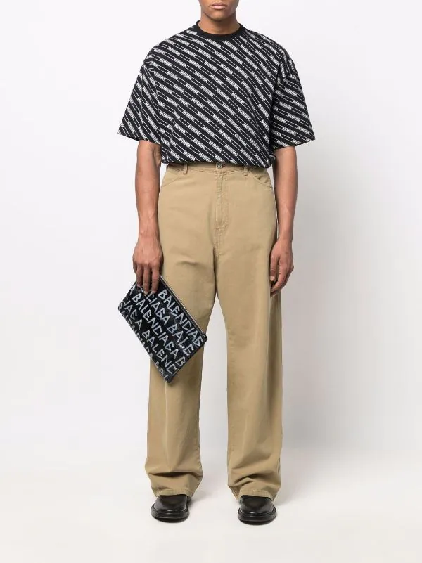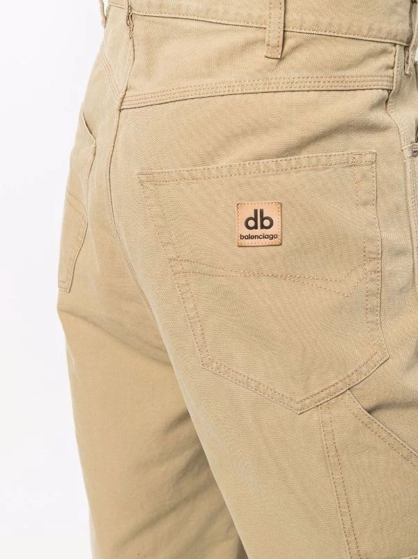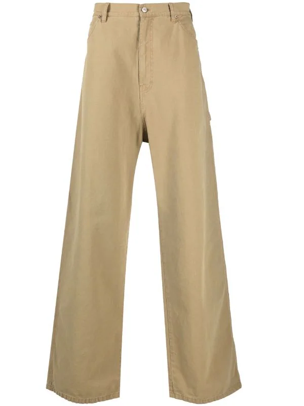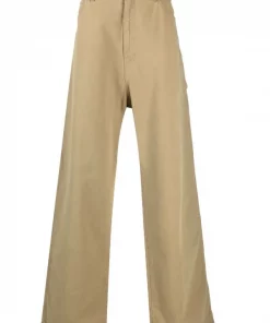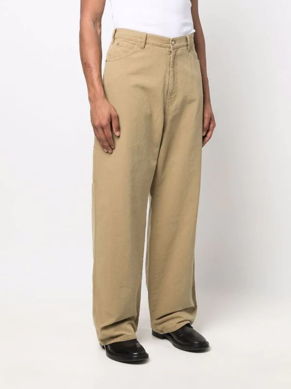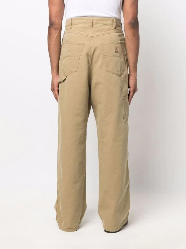 Patch logo sur l’arrière, taille haute, passants de ceinture, coupe ample, fermeture à zip et boutons sur le devant, cinq poches classiques. Couleur : tons neutres. Matière : coton.