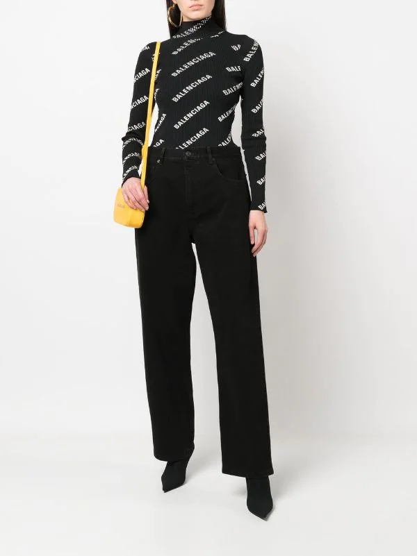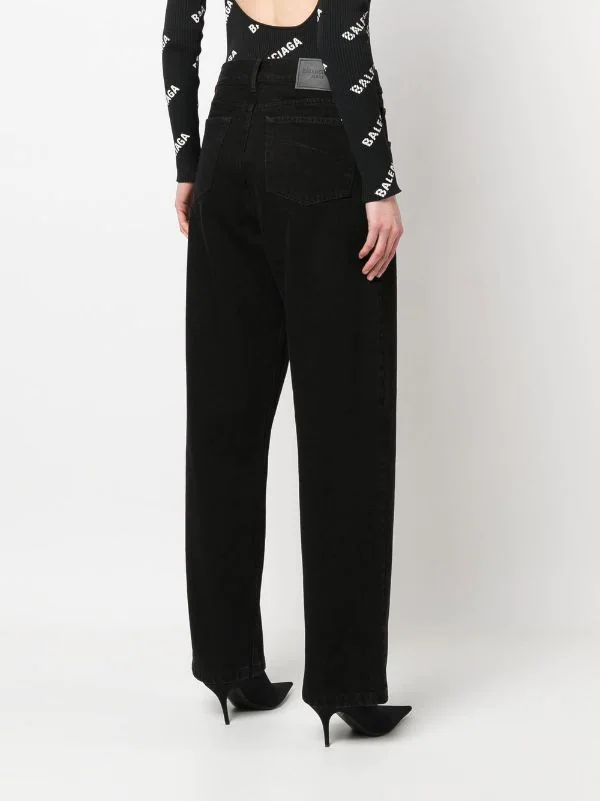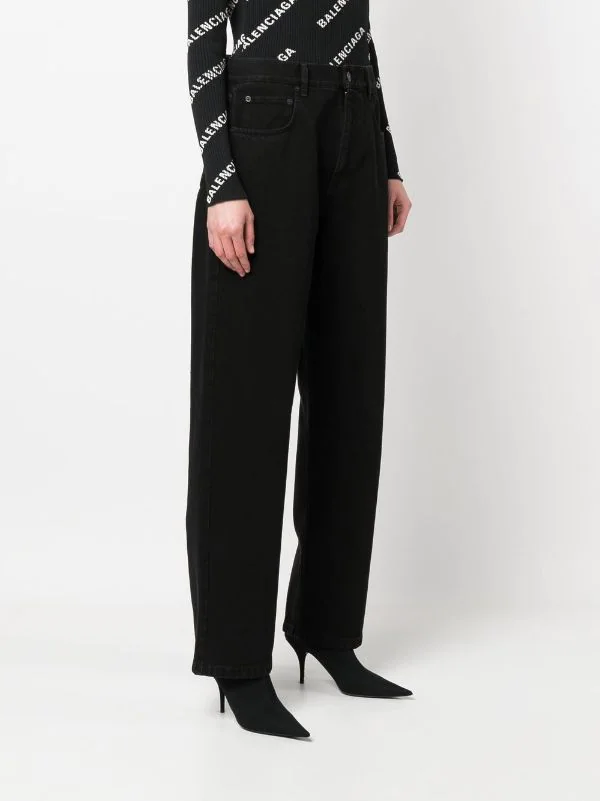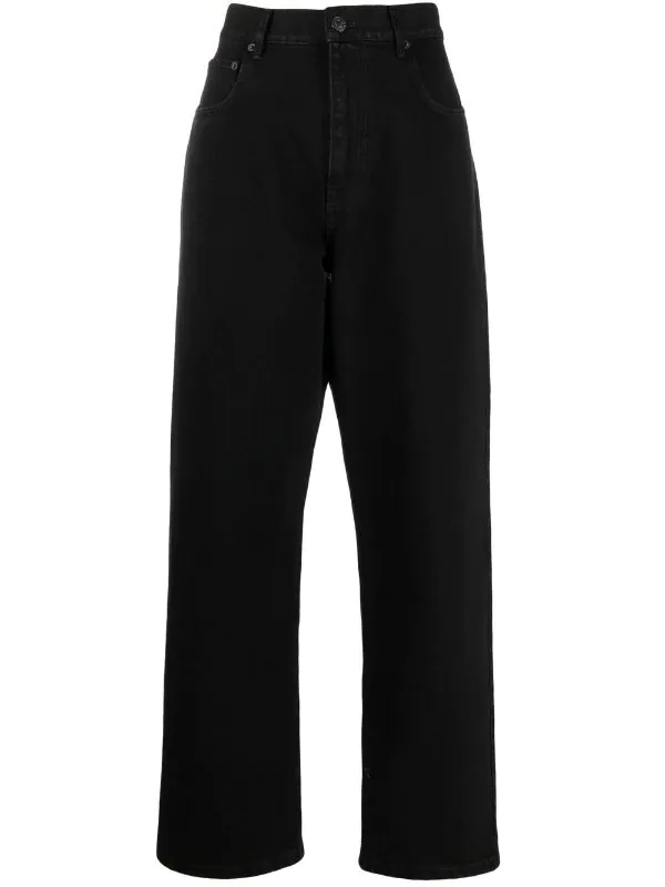 Noir, coton, patch logo sur l’arrière, taille haute, fermeture à zip et boutons sur le devant, cinq poches classiques, coupe ample.