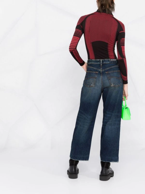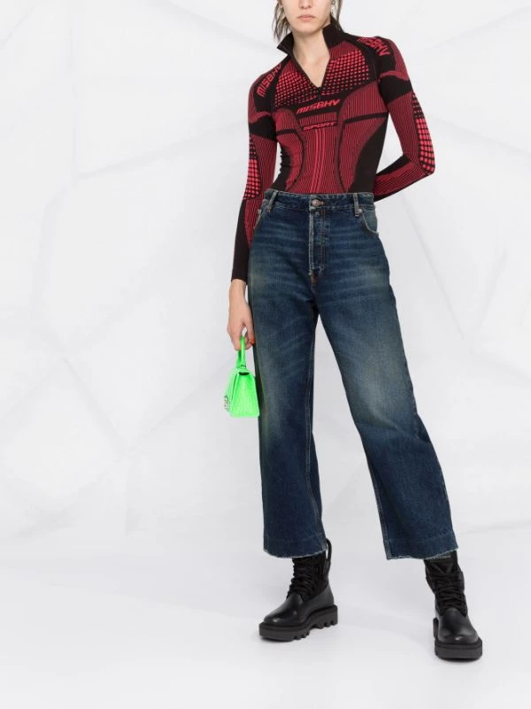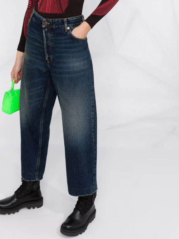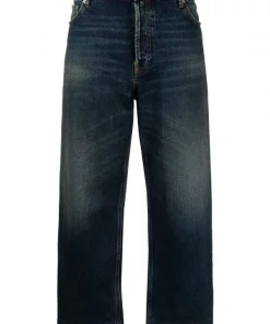 Effet usé, patch logo sur l’arrière, coupe courte, taille haute, passants de ceinture, cinq poches classiques, fermeture à zip et boutons sur le devant. Couleur : bleu. Matière : coton.