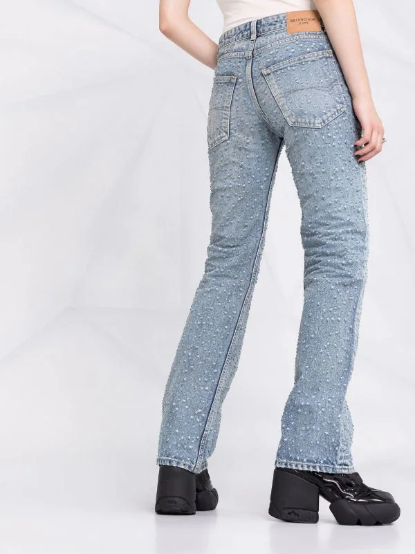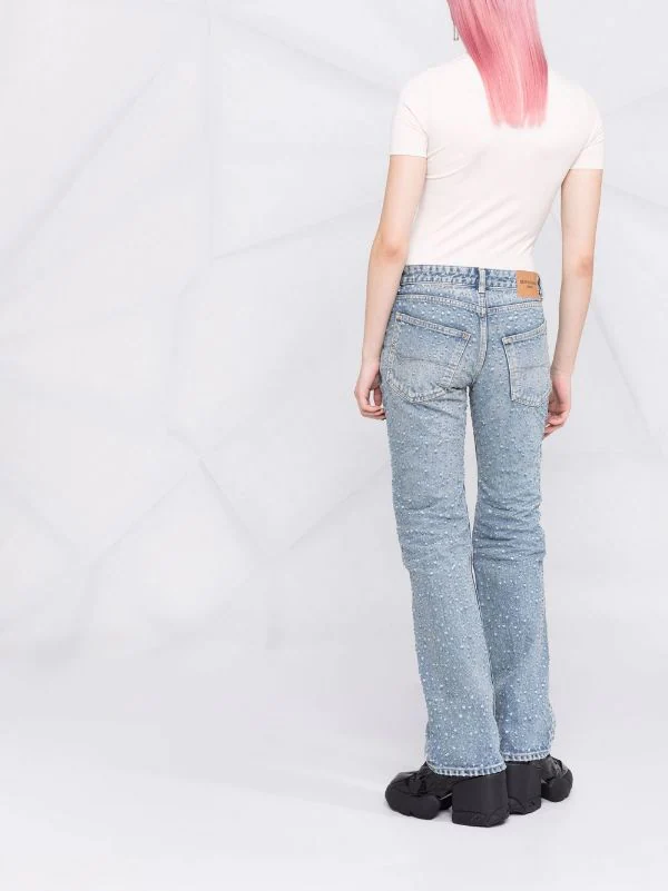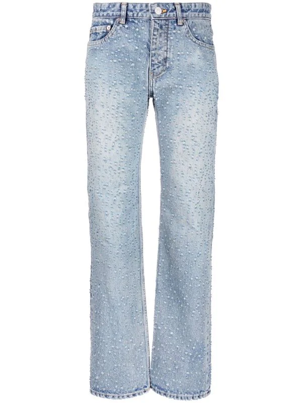 Effet usé, effet délavé, coupe droite, taille mi-haute, cinq poches classiques, boutonnière sur le devant. Couleur : bleu. Matière : coton.