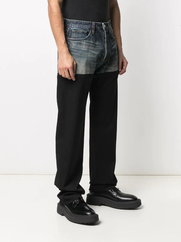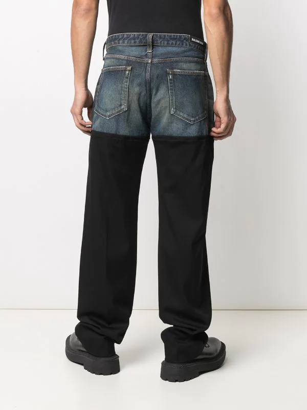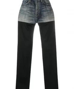 Modèle bicolore, fermeture boutonnée, passants de ceinture, 5 poches classiques, coupe droite. Matière : denim.
