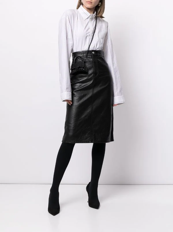 Patch logo sur l’arrière, taille haute, fermeture boutonnée, passants de ceinture, cinq poches classiques, ourlet droit. Couleur : noir. Matière : cuir.