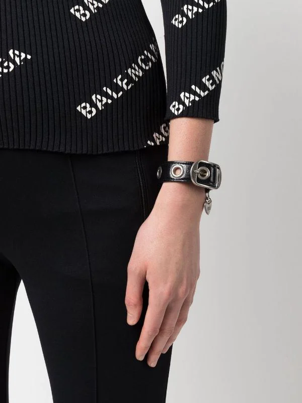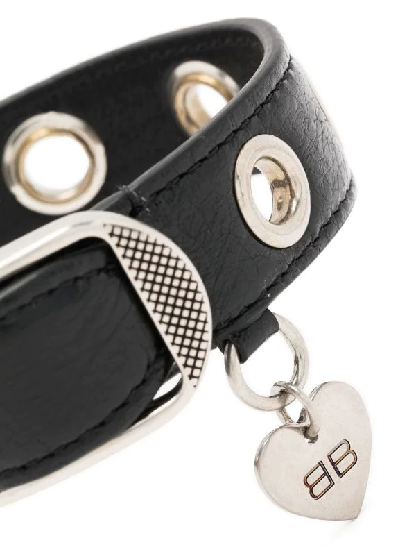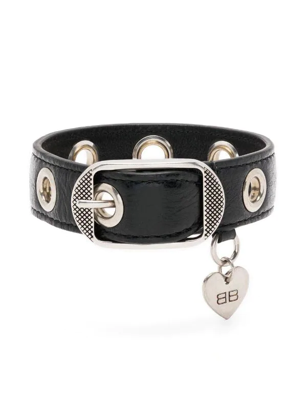 Le Cagole eyelet-detail bracelet from BALENCIAGA featuring black, leather, silver-tone hardware, eyelet detailing, heart charm and buckle fastening. POSITIVELY CONSCIOUS: We’ve partnered with Good On You — an ethical agency that rates how sustainably brands perform across various people, planet and animal welfare criteria. This product comes from a Conscious brand that performs well in relation to their impact on the planet, for example ensures the use of materials that limit the amount of chemicals, water and wastewater involved in production processes..