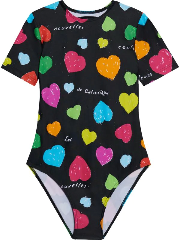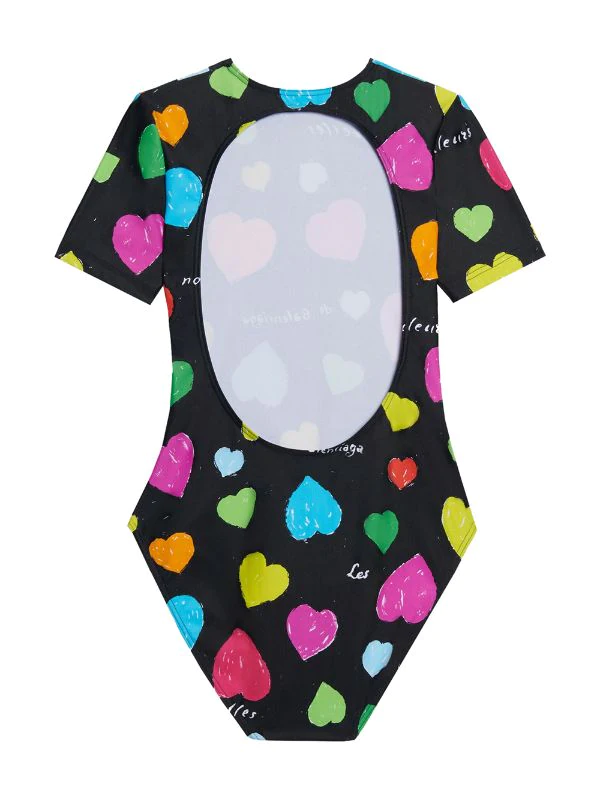Imprimé à cœurs, encolure ronde, dos-nu, manches courtes. Veillez à essayer les maillot de bain par-dessus vos propres sous-vêtements.