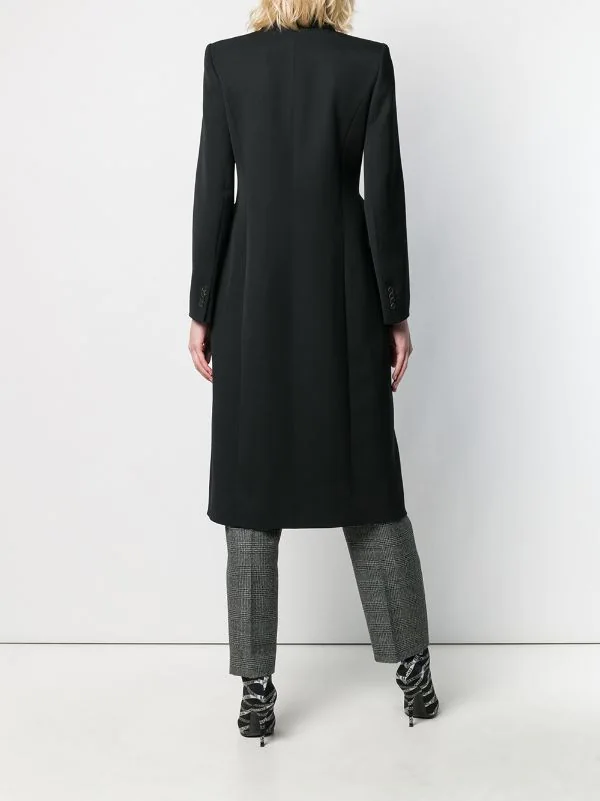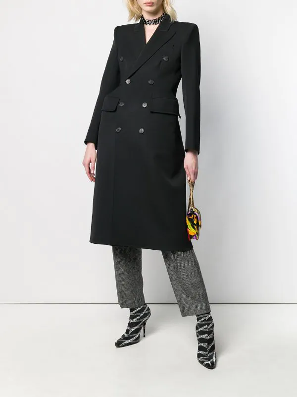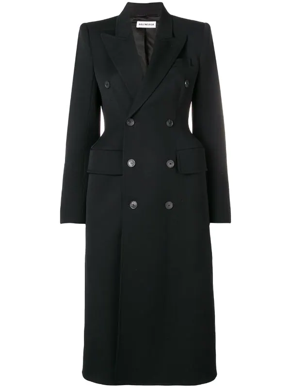 Revers pointus, boutonnière croisée sur le devant, coupe ajustée, poches latérales à rabat, poignets boutonnés, doublure et coupe midi. Couleur: noir.