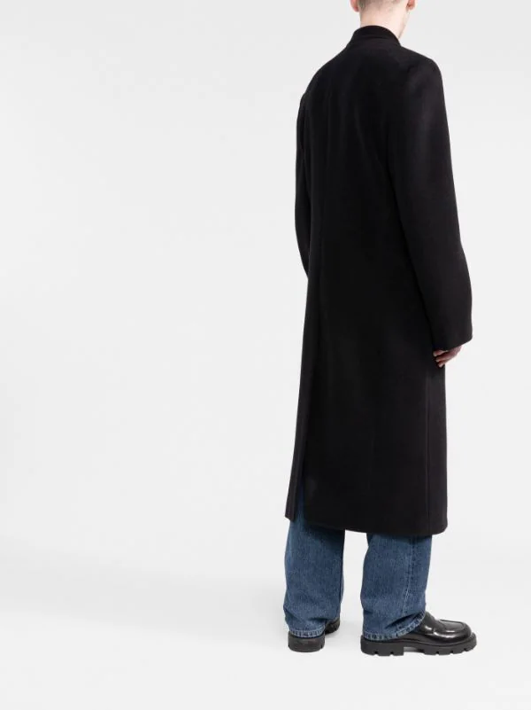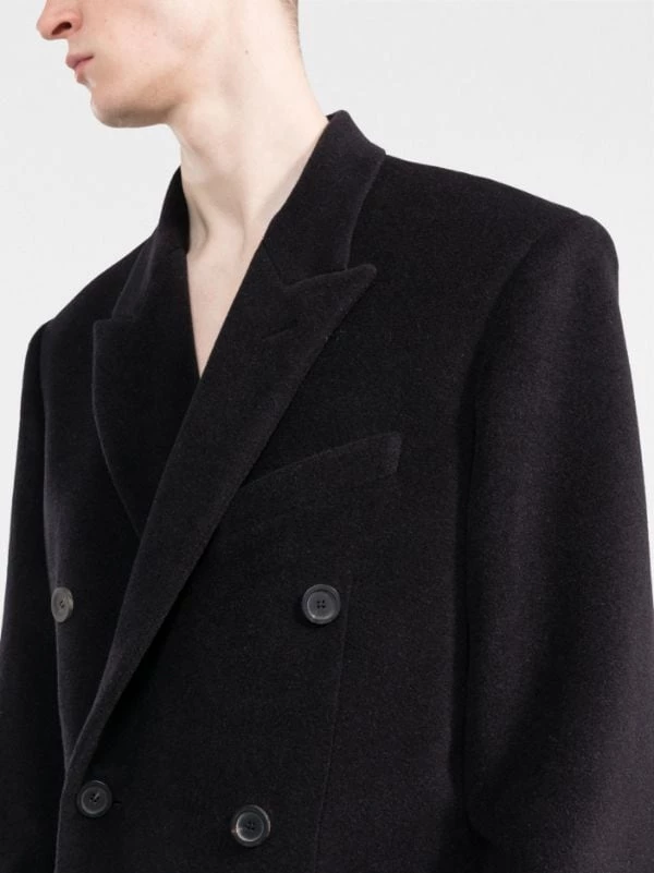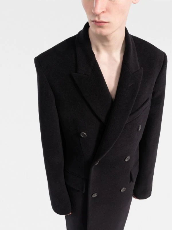 Revers pointus, boutonnière croisée, manches longues, coupe mi-longue, deux poches latérales à rabat, poche poitrine passepoilée. Couleur : noir.