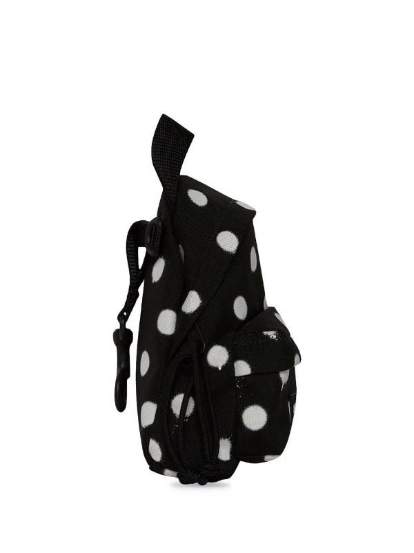 Imprimé à pois, patch logo sur le devant, anse classique, fermeture zippée, compartiment principal, poche intérieure plaquée, compartiment zippé sur le devant, crochets pour clip solaire, bride porté épaule détachable et ajustable.