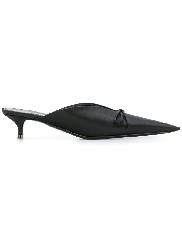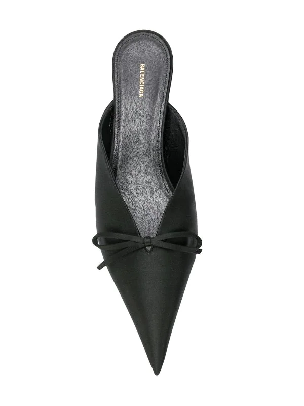 Mules Knife en satin de soie noir Balenciaga avec bout pointu, nœud sur le devant, semelle intérieure à logo et talon bobine.