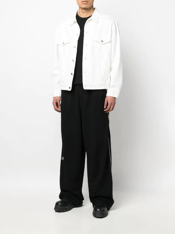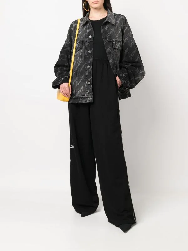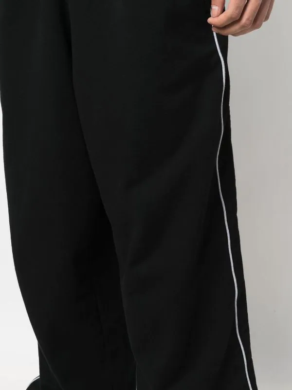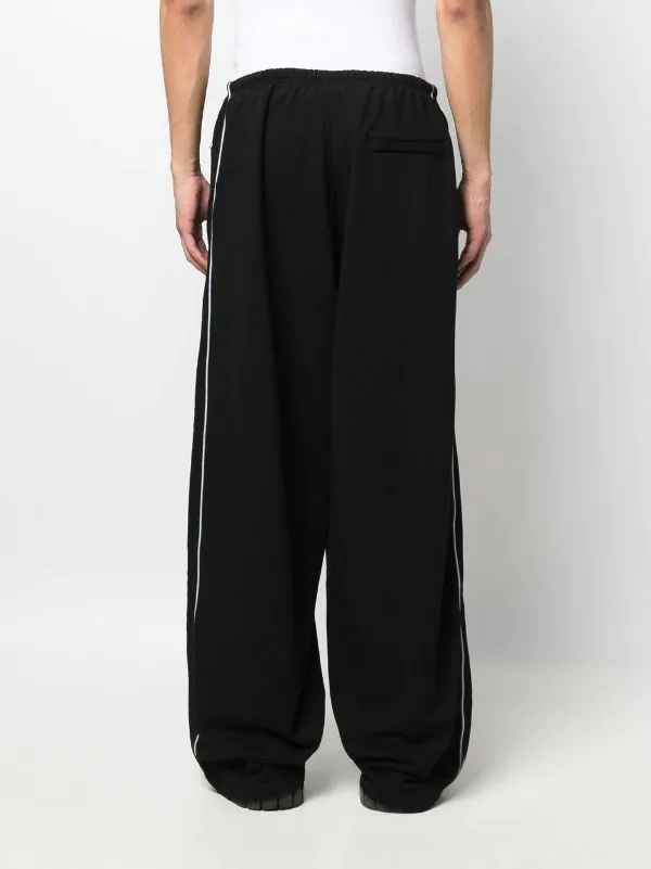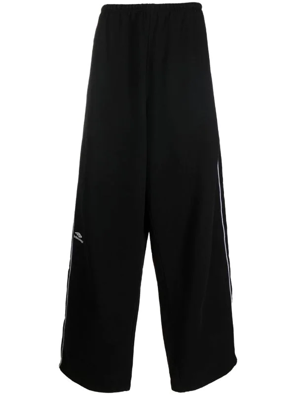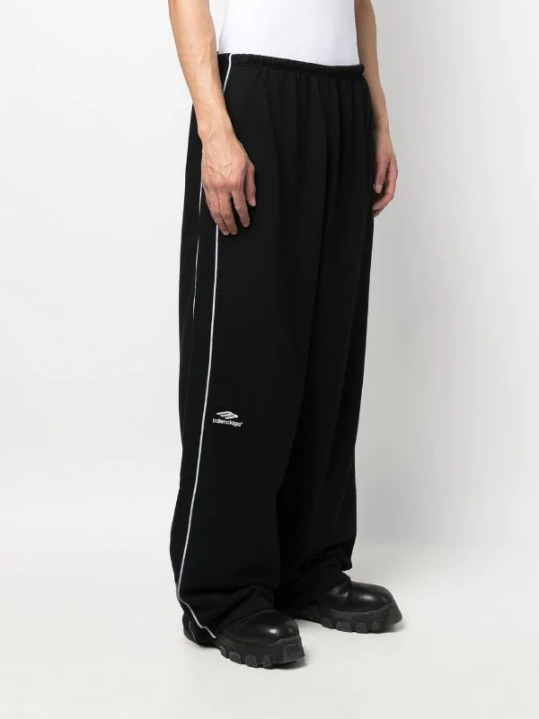 Noir, coton, logo brodé sur le côté, détail de rayure latérale, taille haute, ceinture élastique, poches latérales fendues, coupe ample.