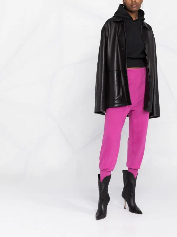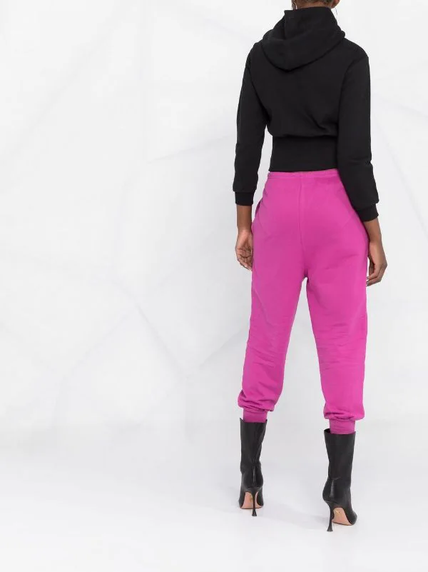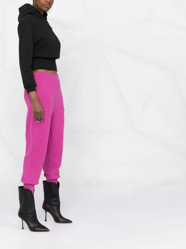 Fuchsia, coton, logo brodé sur le côté, ceinture élastique, deux poches latérales fendues, coupe fuselée, poignets élastiqués.