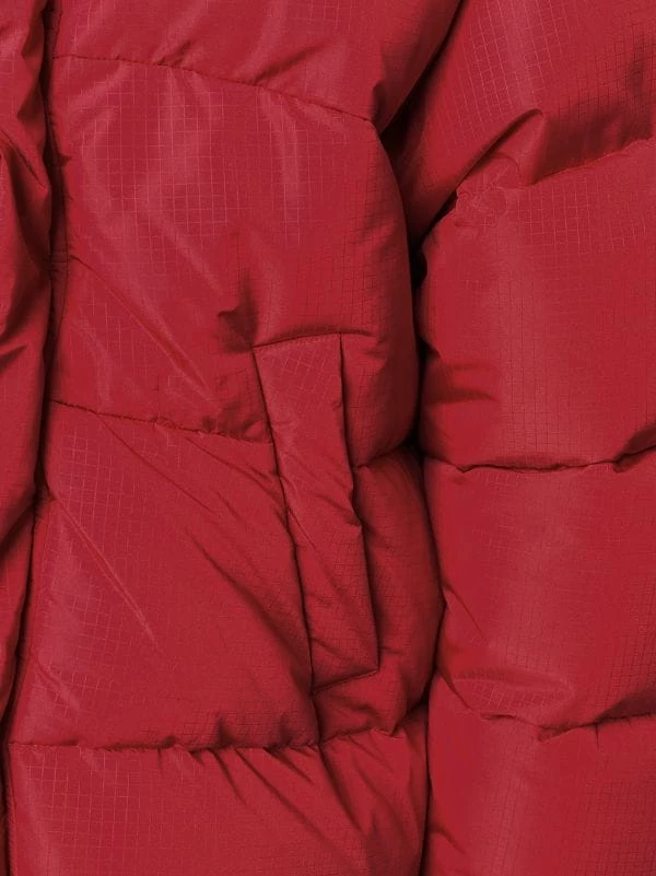Design matelassé, capuche classique, fermeture dissimulée sur le devant, deux poches latérales plaquées, manches longues, ourlet droit. Couleur : rouge.