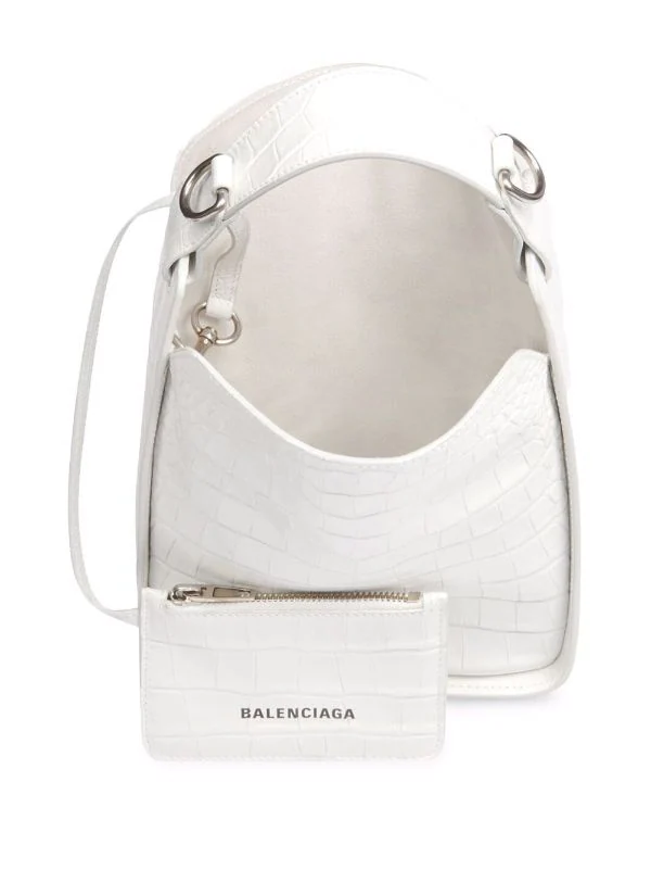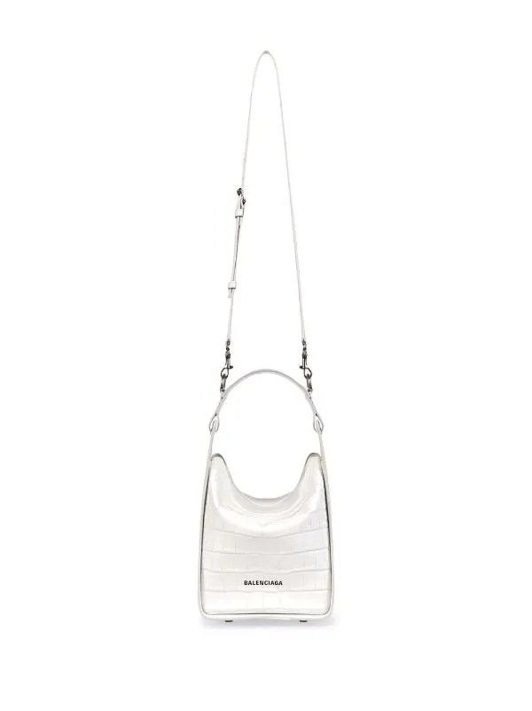 Effet peau de crocodile, pochette détachable, bride porté épaule détachable et ajustable, anse classique, compartiment principal. Couleur : blanc. Matière : cuir de veau.