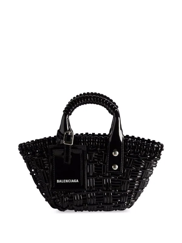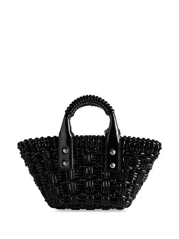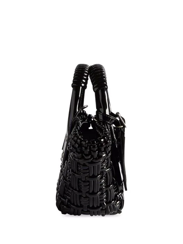 Design en osier tressé, fini brillant, étiquette en cuir, anses sur le dessus, ouverture sur le dessus, poches intérieures zippées, bride porté épaule détachable et ajustable. Couleur : noir. Matière : cuir artificiel.