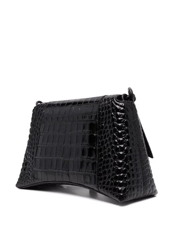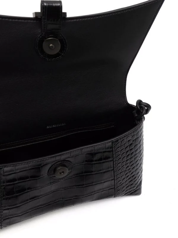 Effet peau de crocodile, forme arrondie, breloque lettre, rabat sur le devant, fermeture magnétique, poches intérieures zippées, poche plaquée à l’arrière, bride porté épaule en chaîne. Couleur : noir. Matière : cuir.
