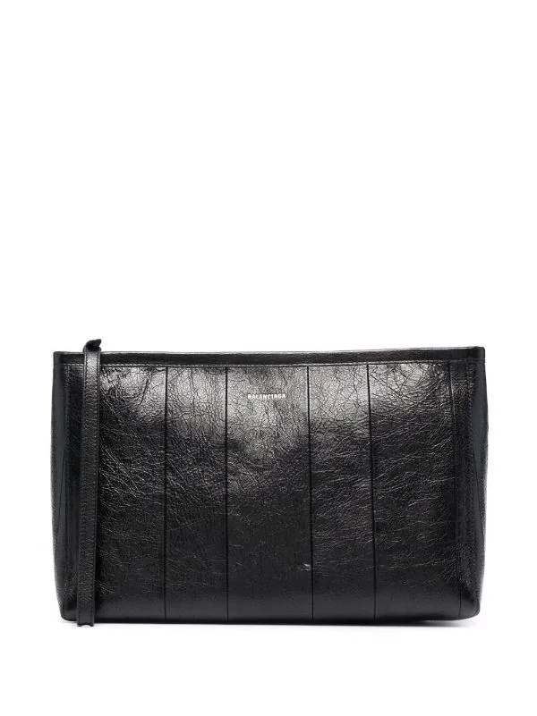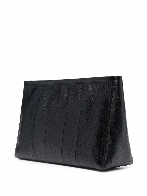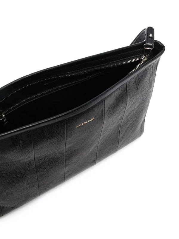 Logo doré, texture grainée, fermeture zippée sur le dessus, compartiment principal. Couleur : noir. Matière : cuir.