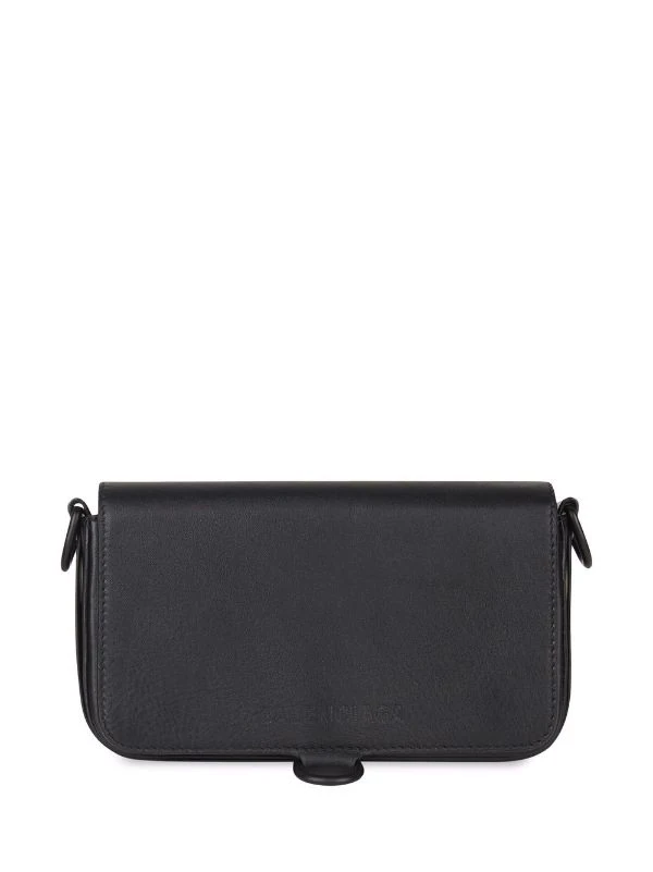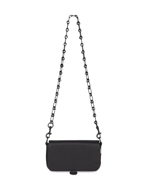 Bride porté épaule en chaîne détachable, rabat sur le dessus à fermeture magnétique, compartiment intérieur. Couleur : noir. Matière : cuir de veau.