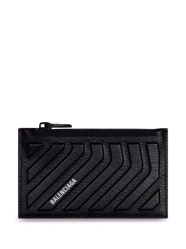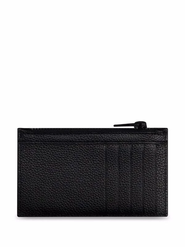 Texture grainée, détail nervuré, logo imprimé sur le devant, fermeture zippée sur le dessus, fentes pour carte. Couleur : noir. Matière : cuir.