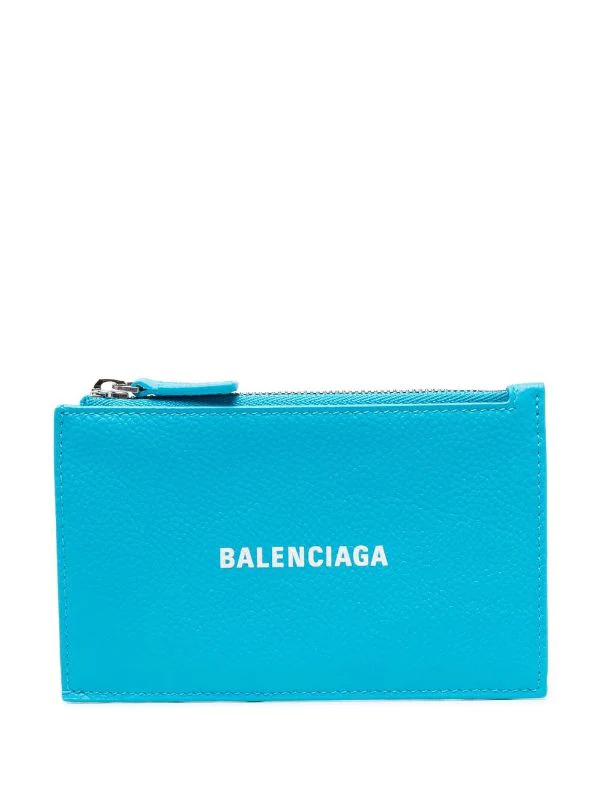 Cyan, cuir, logo imprimé sur le devant, fentes pour cartes à l’arrière, fermeture zippée sur le dessus, forme rectangulaire.