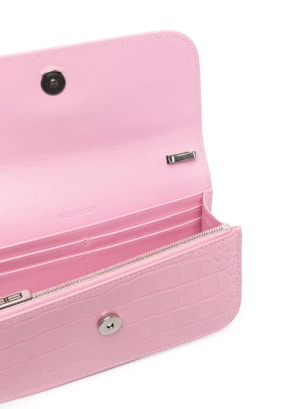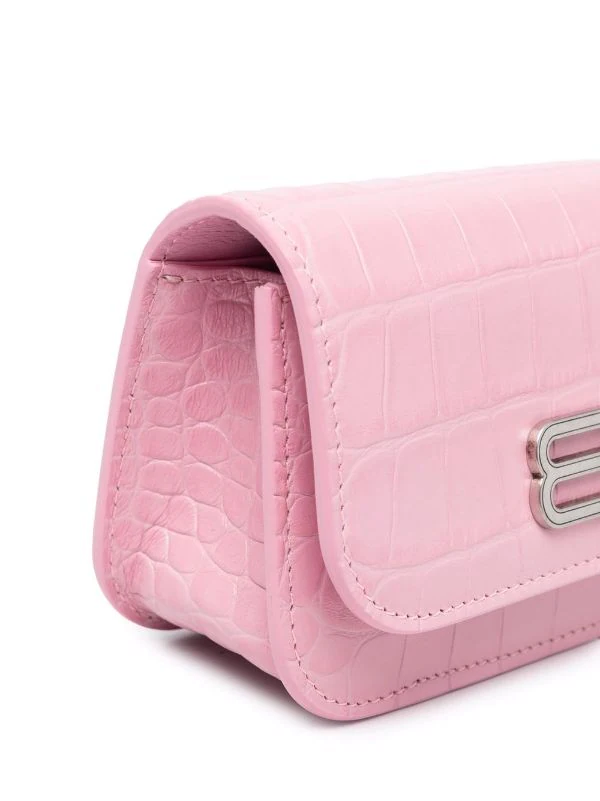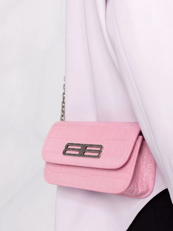 Plaque logo argentée, effet peau de crocodile, bride porté épaule en chaîne détachable, rabat sur le dessus à fermeture magnétique, compartiment principal, poches intérieures zippées, compartiments intérieurs pour carte. Couleur : rose. Matière : cuir.