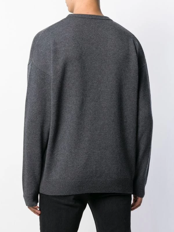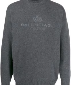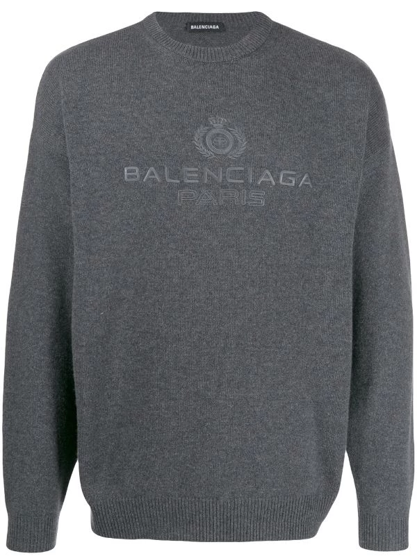 Pull à logo brodé en cachemire Balenciaga avec encolure ronde, manches longues, ourlet et poignets nervurés et logo contrastant brodé sur la poitrine. Couleur : gris.