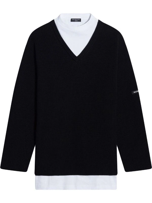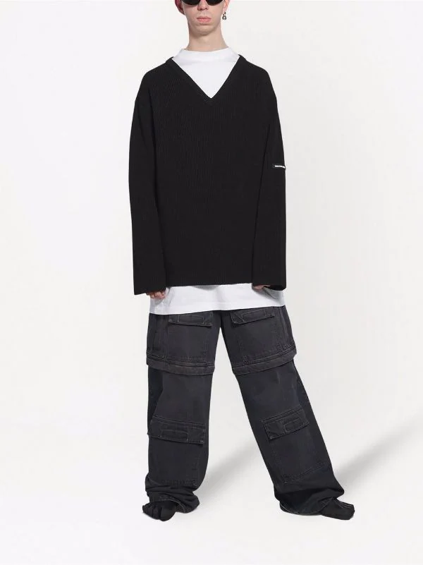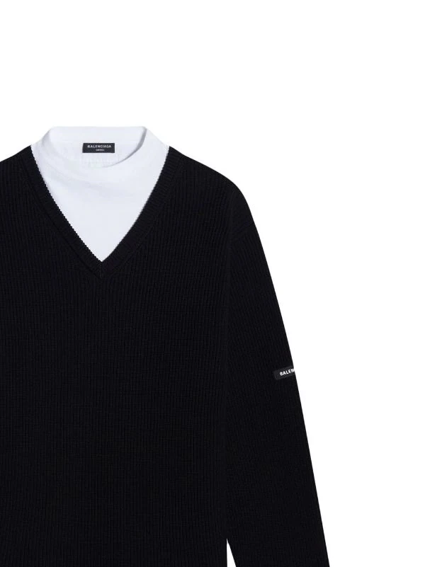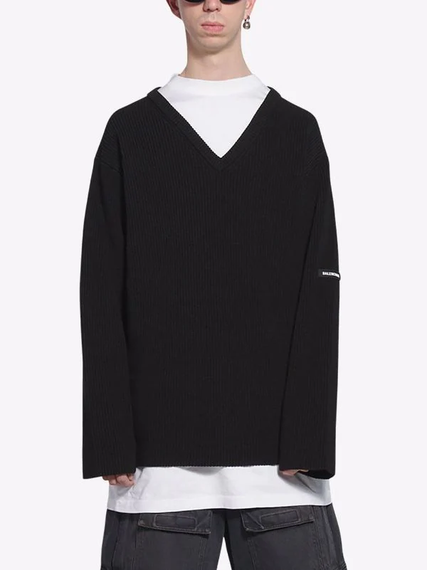 Patch logo sur la manche, effet superposé, encolure ronde, col v, maille nervurée, manches longues. Matière : coton.