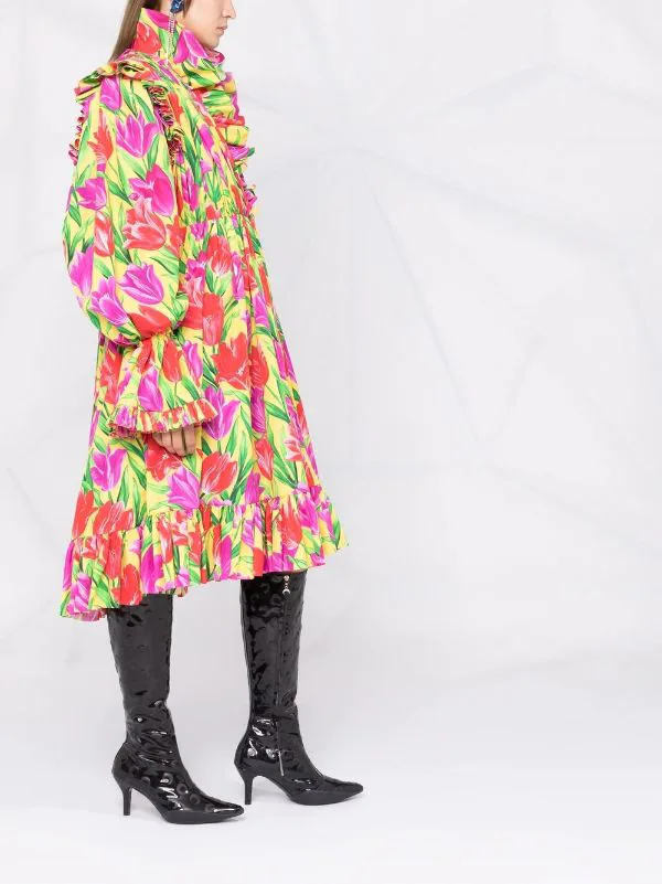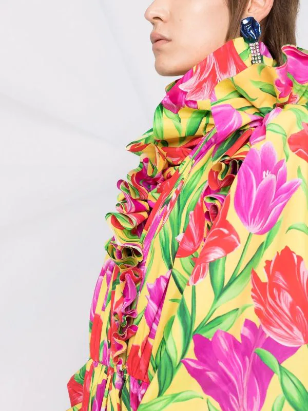 Motif de fleurs, col montant volanté, détails de volants, poignets élastiqués, ourlet volanté, coupe mi-longue. Couleur : multicolore.