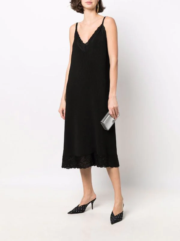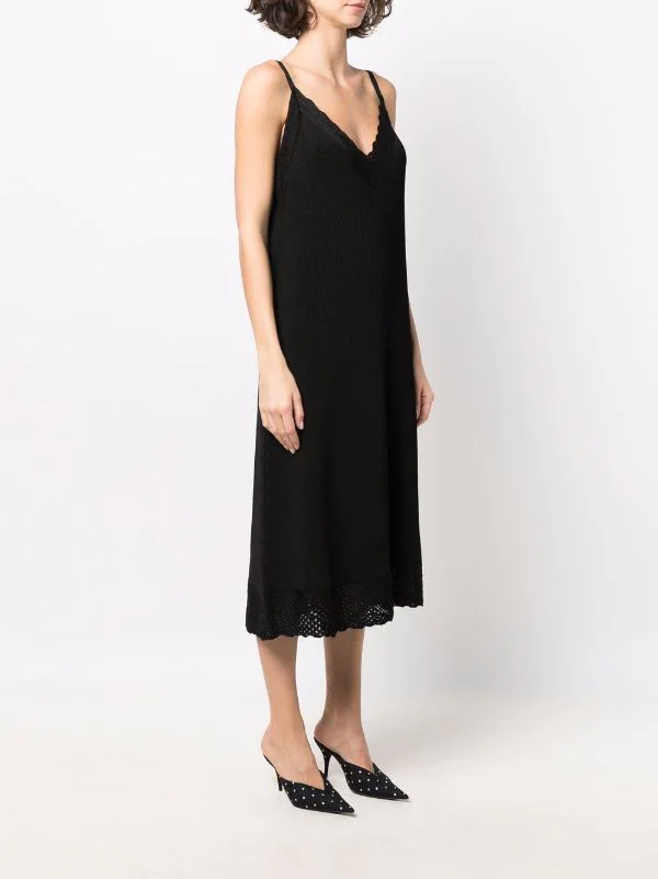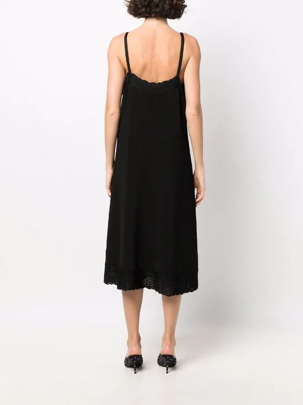 Maille nervurée, finitions en pointelle, bordures festonnées, col v, fines bretelles, hauteur genou. Couleur : noir.