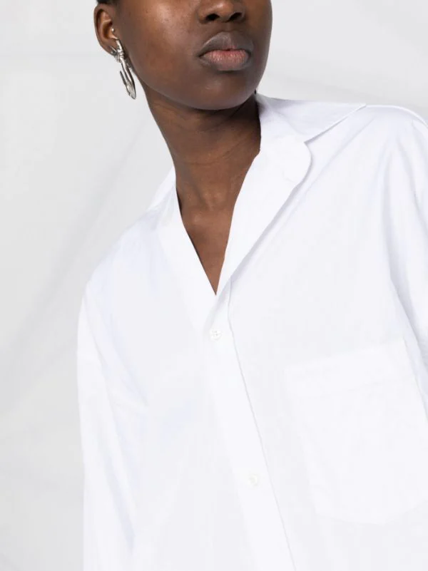Blanc, coton, détail torsadé, design asymétrique, col italien, col v, boutonnière sur le devant, poche poitrine plaquée, épaules tombantes, manches extra-longues, poignets boutonnés, coupe longue.