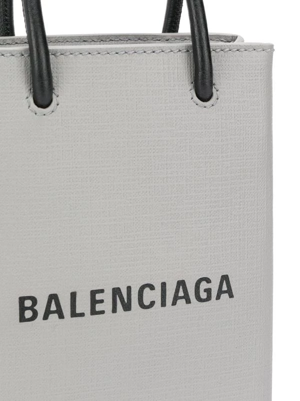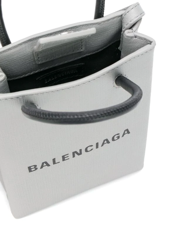 Sac à bandoulière à logo imprimé Balenciaga avec anses arrondies, bride portée épaule, logo imprimé au centre, design ouvert sur le dessus et patch logo intérieur. Couleur : gris.