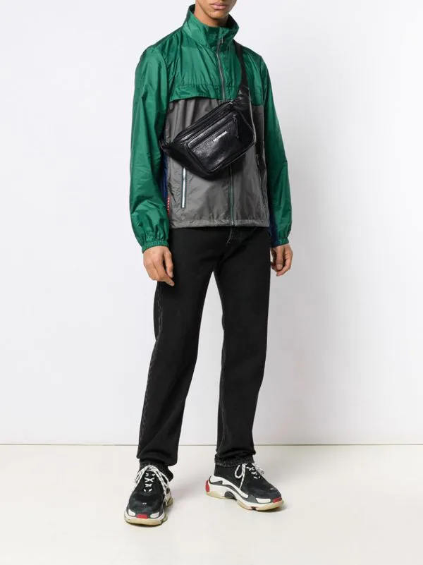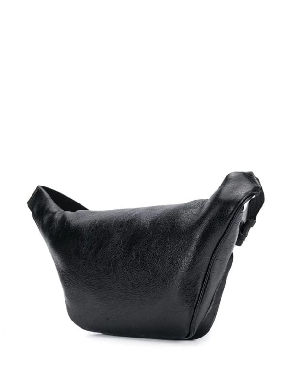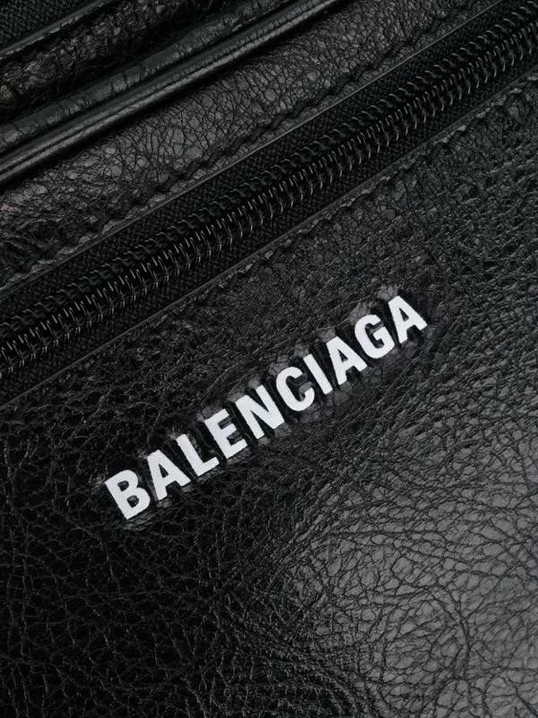 Sac Banane Explorer en cuir d’agneau Balenciaga avec taille ajustable, fermeture zippée devant, poche zippée devant et compartiment intérieur. Couleur : noir.