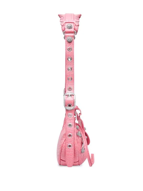 Effet peau de crocodile, détails de clous, ornement en strass, finitions à boucle décorative, bride porté épaule ajustable, fermeture zippée sur le dessus, compartiment principal, patch logo intérieur, pochette détachable, étiquette miroir, finitions en métal argenté. Couleur : rose. Matière : cuir.