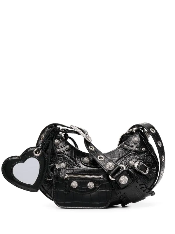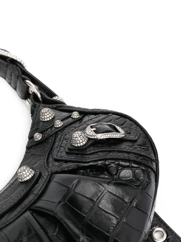 Effet peau de crocodile, détails de clous, ornement en strass, finitions à boucle décorative, bride porté épaule ajustable, fermeture zippée sur le dessus, compartiment principal, patch logo intérieur, pochette détachable, étiquette miroir, finitions en métal argenté. Couleur : noir. Matière : cuir.