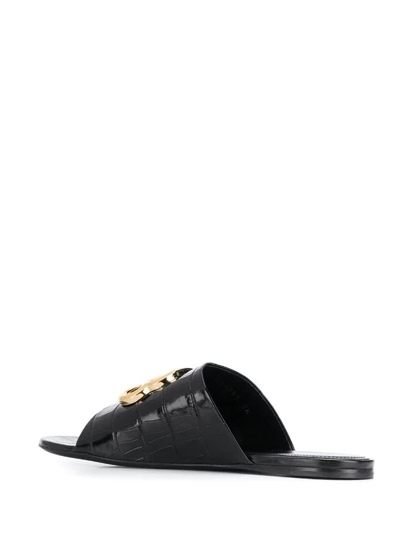 Bracelet à effet peau de crocodile, plaque logo dorée, bout ouvert, talon ouvert, semelle plate. Couleur : noir. Matière : cuir.