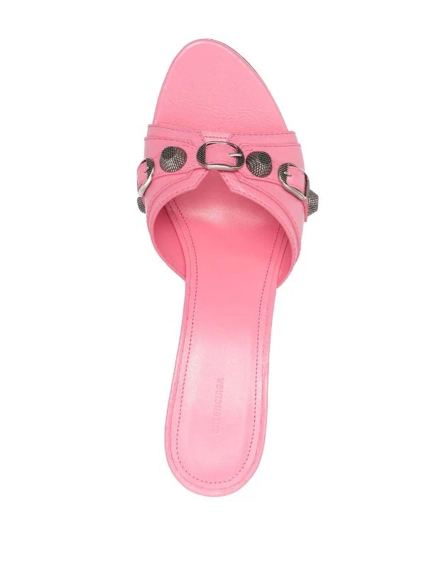 Bout ouvert, talon mi-haut, finitions en métal argenté, design à enfiler. Matière : cuir.