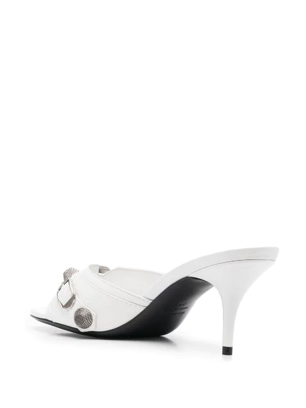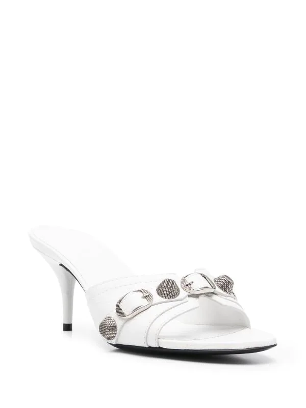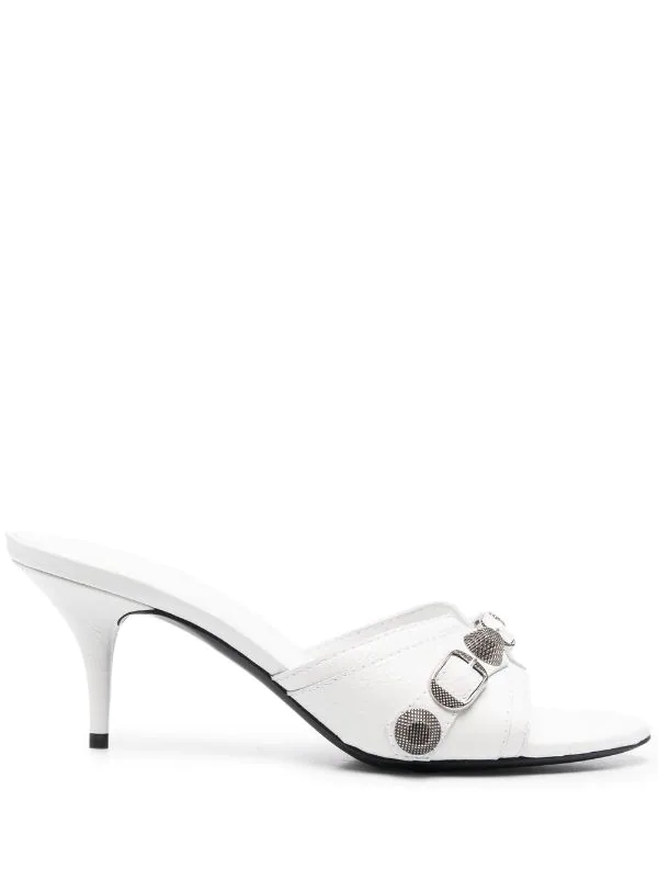 Détails de clous argentés, détail de boucle décorative, semelle intérieure griffée, bout ouvert, design à enfiler.