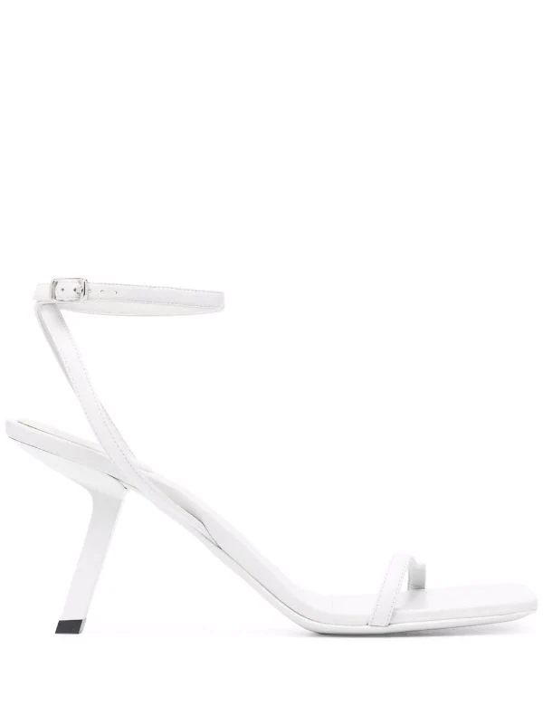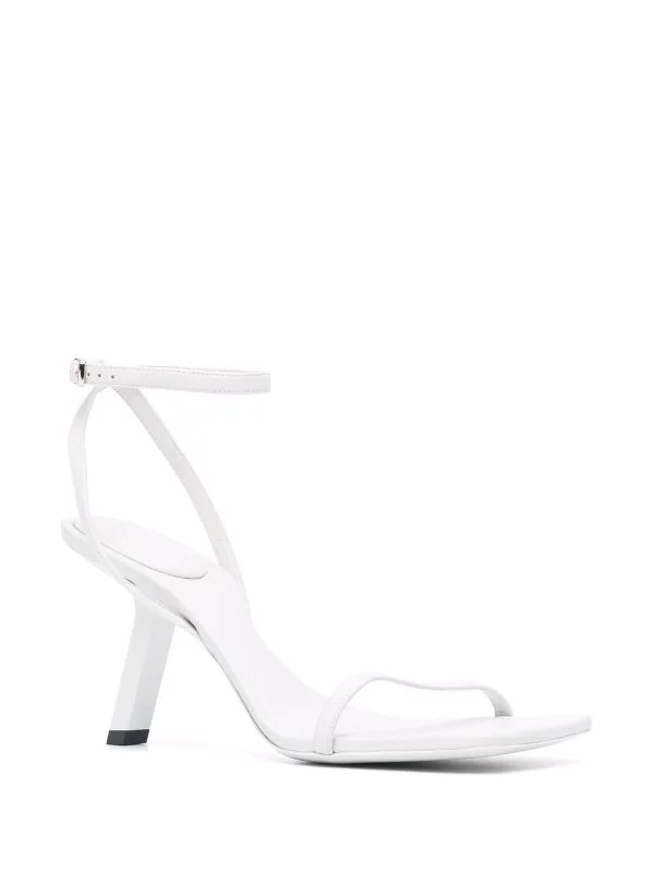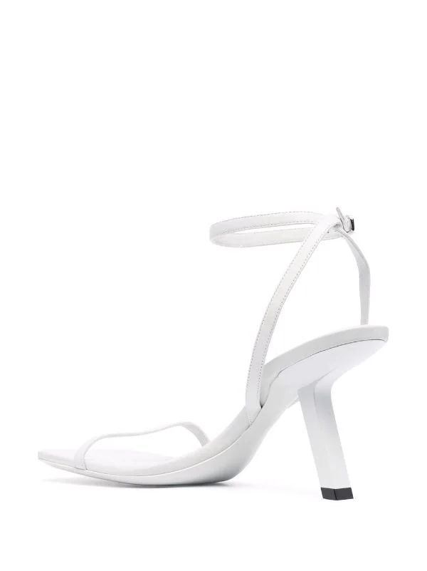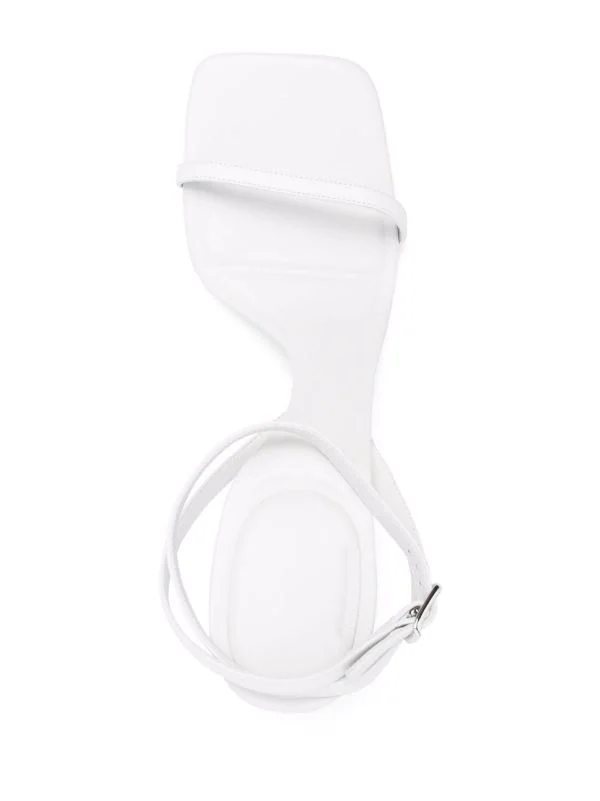 Bout ouvert, semelle intérieure à logo, bride cheville à boucle, talon sculpté haut. Couleur : blanc. Matière : cuir de veau.
