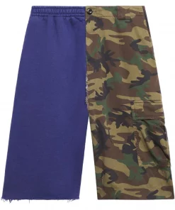Modèle bicolore, texture polaire, imprimé camouflage, ceinture élastique, poche latérale cargo, bords francs. Matière : coton.