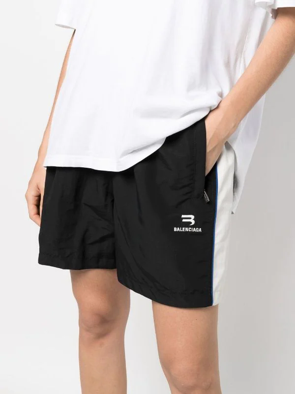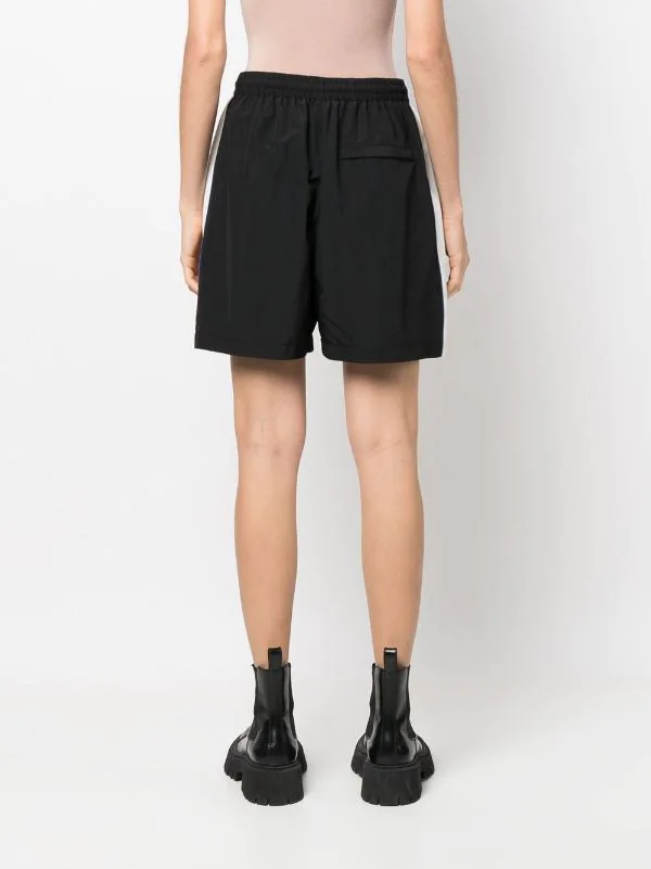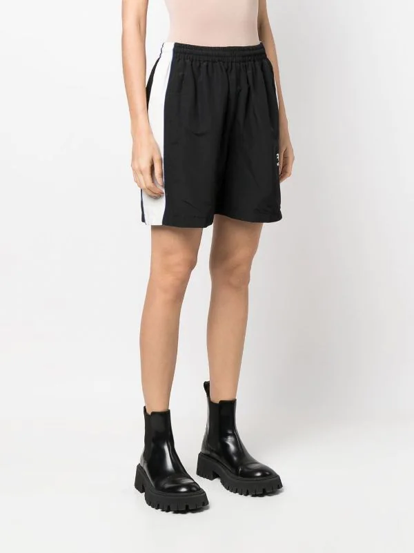 Noir, blanc, logo brodé sur le devant, détail de rayure latérale, ceinture élastique, coupe droite.
