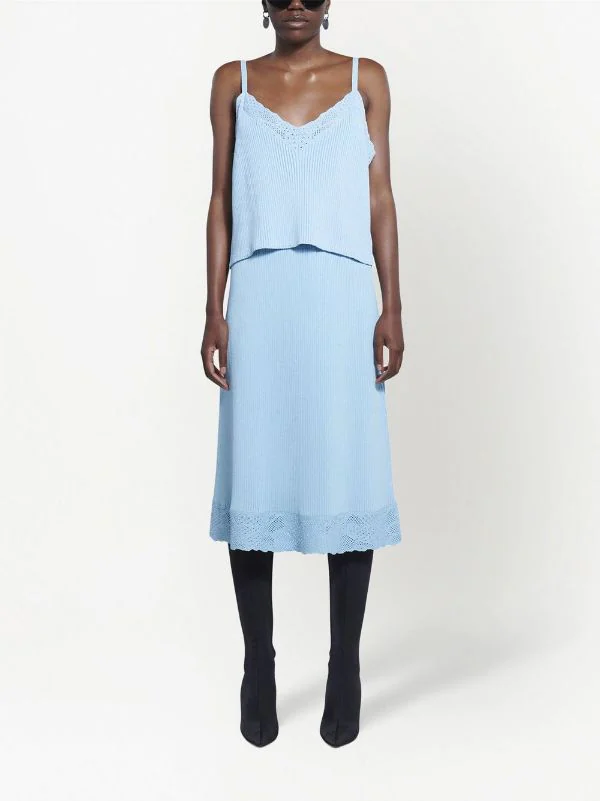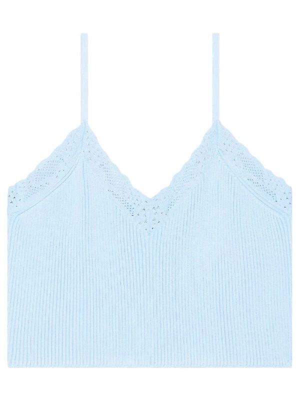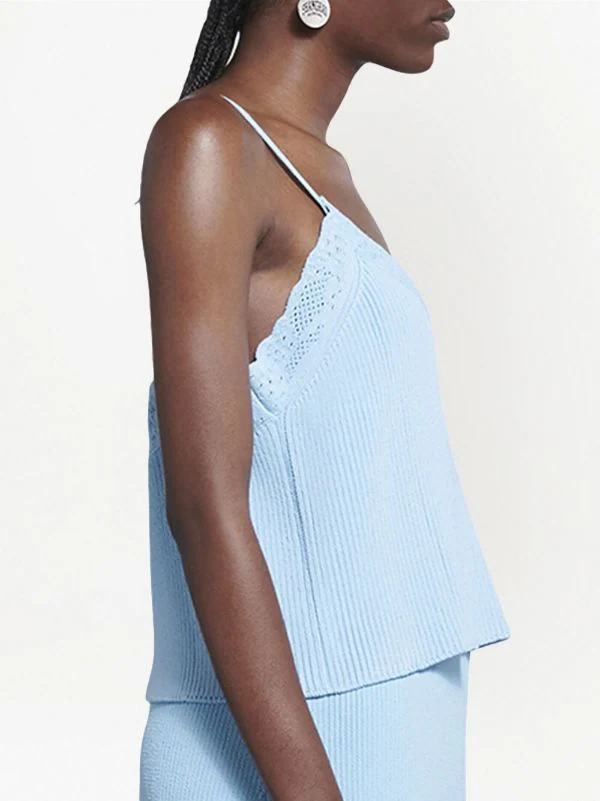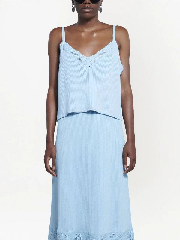 Détail nervuré, col v, fines bretelles, coupe courte.