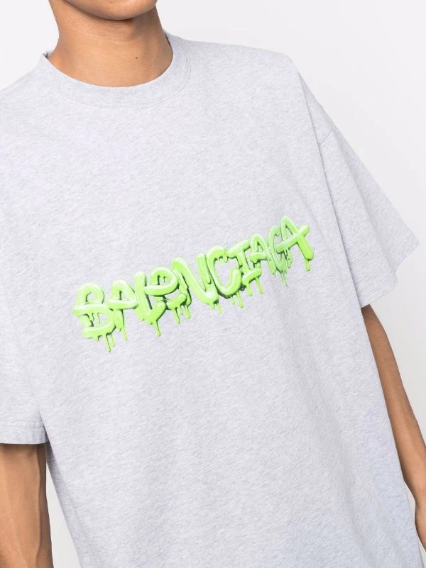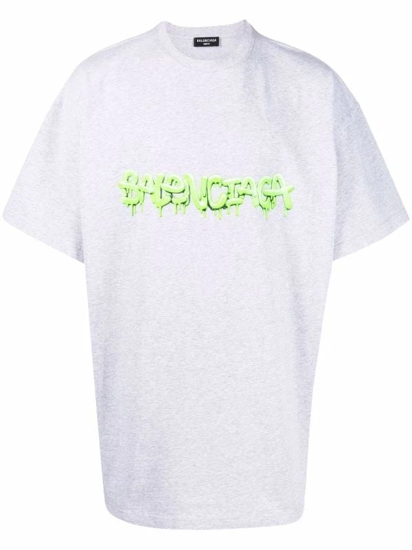 Balenciaga arbore ses références de streetwear avec le logo imprimé au style graffiti sur la poitrine. Le motif vert vif apparaît sur un fond gris chiné.