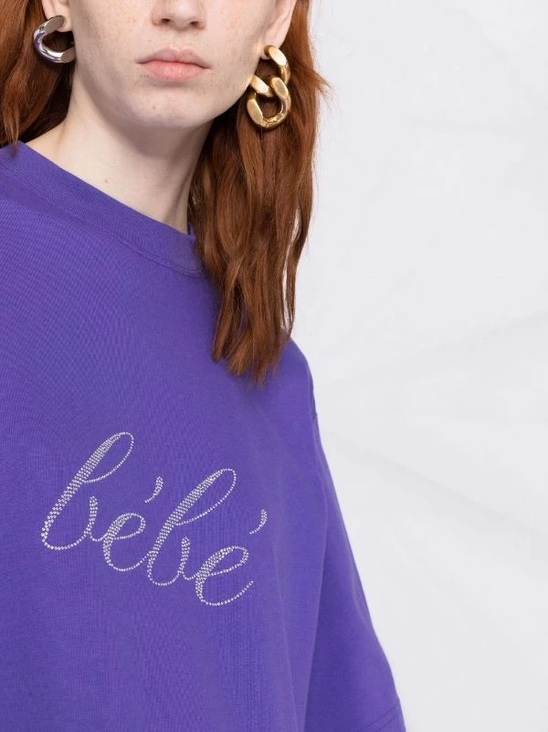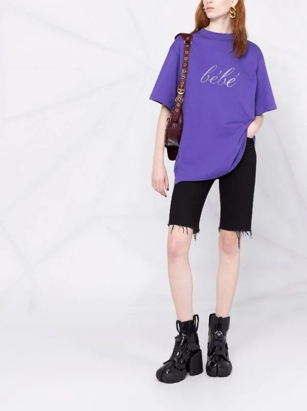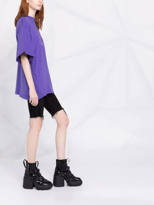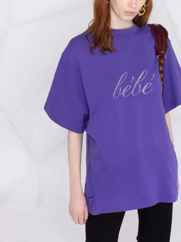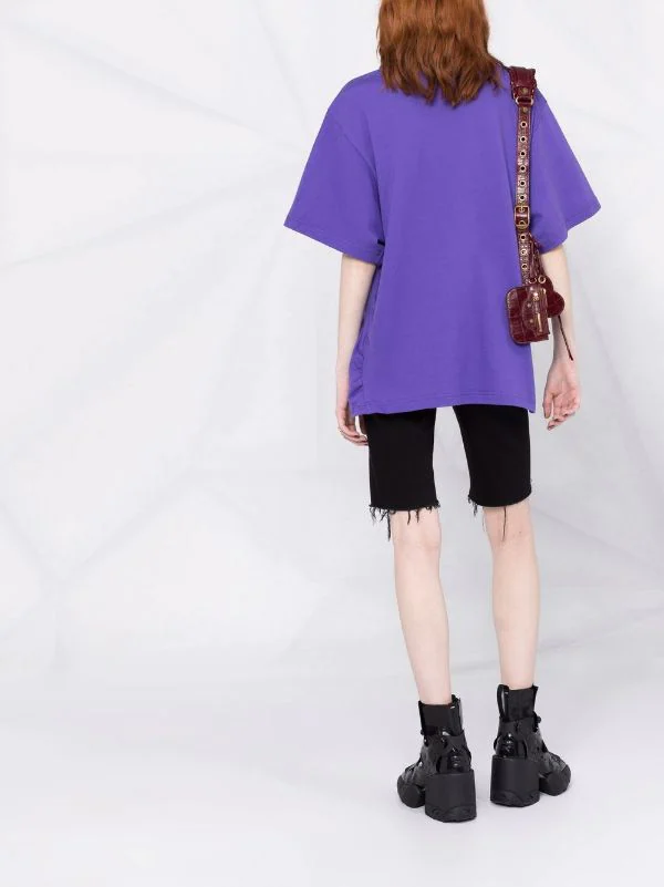 Slogan imprimé sur l’avant, encolure ronde, épaules tombantes, manches mi-longues, ourlet droit. Couleur : violet. Matière : coton.